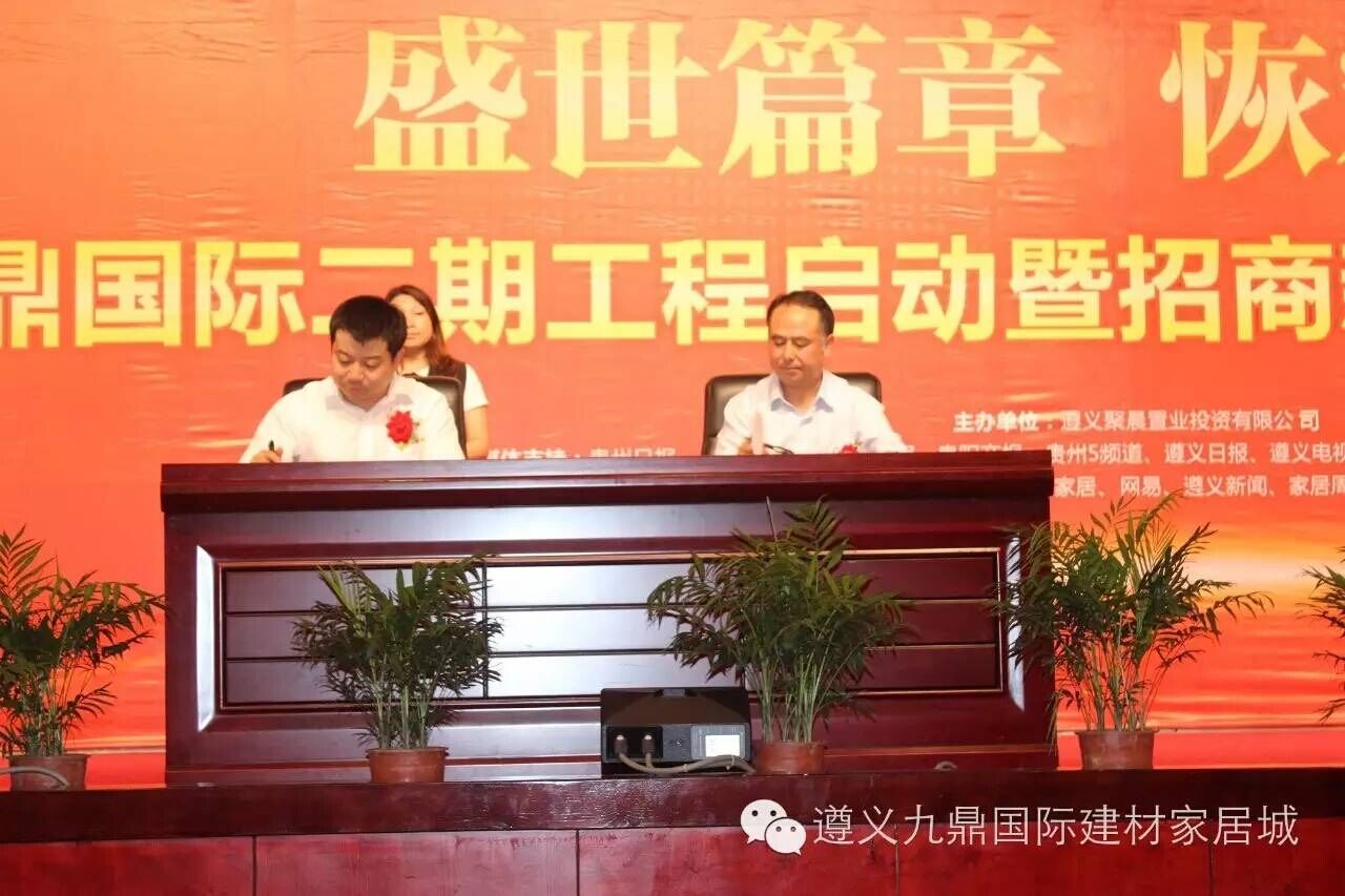 金牌櫥柜、楚楚吊頂、好太太晾衣架、金意陶瓷磚、好萊客衣柜、皇派門業、玉蘭壁紙、德爾地板、吉柏利吊頂、大自然地板、歐雅壁紙窗簾、愛麗克斯凈水器、友邦集成吊頂、恒潔衛浴石峰、顧家家居、慕思寢具、歐麗亞木門、圣世莊園、皮阿諾櫥衣柜、金藝達燈飾、瑞美恒熱熱水器、阿波羅衛浴、富美家居、方太櫥柜、舒適100、馬可波羅瓷磚、蒙拉麗莎瓷磚等近三十家遵義建材家居市場主力商戶與九鼎國際建材家居城現場簽約,九鼎國際建材家居城董事長朱冬林先生為項目方代表,分別與以上品牌商家代表逐一簽約。